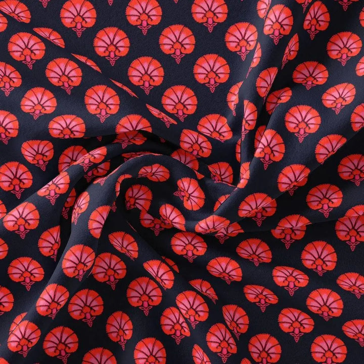 Introducing the Beautiful Red Floral Over Dark Blue Base Printed Fabric from FAB VOGUE Studio. This fabric is made of high-quality Polyester and Rayon for a luxurious feel. The vibrant red floral pattern stands out against the dark blue base for a striking look. This fabric is perfect for any occasion, from formal gatherings to casual events. Whether you're looking for a dress, a blouse, or a skirt, this fabric is sure to make a statement. With its luxurious feel and eye-catching pattern, this fabric is sure to make your next outfit stand out. Shop now and make a statement with the Beautiful Red Floral Over Dark Blue Base Printed Fabric from FAB VOGUE Studio.