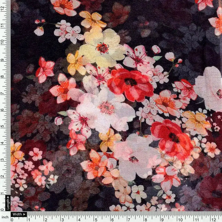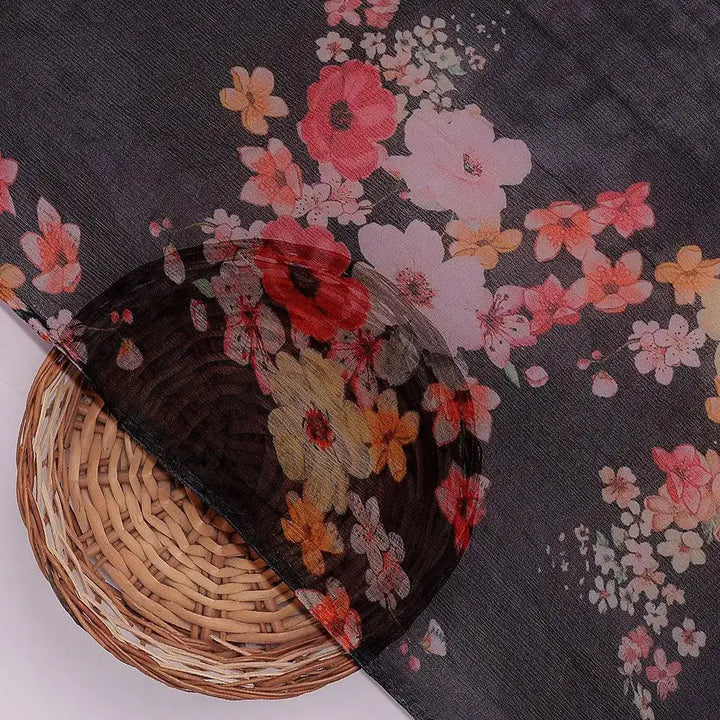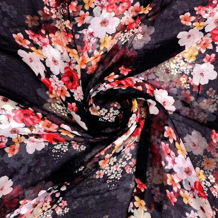 Bring a touch of elegance to your wardrobe with this Colorful Floral Black Base Pure Chiffon Clothing Printed Fabric from FAB VOGUE Studio. Crafted from premium quality Bemberg, this fabric is lightweight yet durable, making it ideal for creating a range of garments. The beautiful floral pattern in vibrant colors adds a chic touch to your look. Whether you want to make a statement with a maxi dress or a blouse, this fabric is perfect for creating a look that will turn heads. Shop now and add a touch of sophistication to your wardrobe.