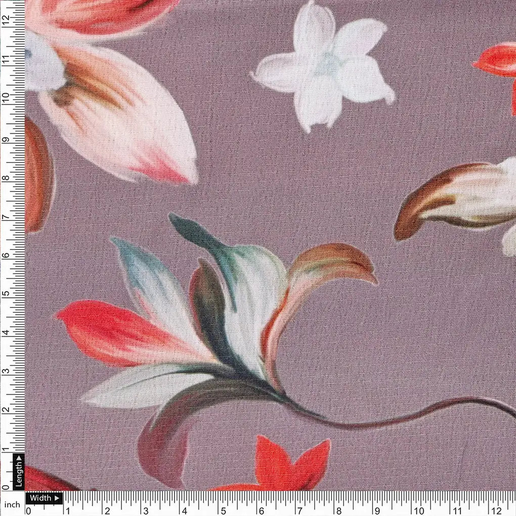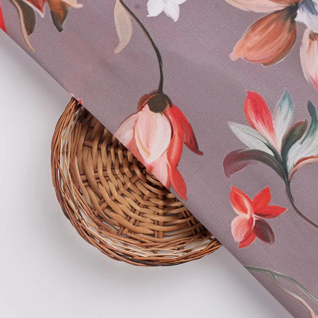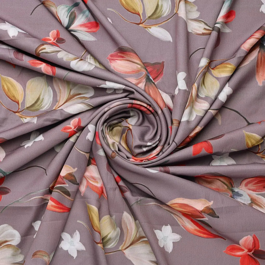 Discover the enchanting beauty of this Mauve Floral Printed Polyester Fabric from FAB VOGUE Studio. Featuring a serene mauve background adorned with an exquisite array of vibrant floral and leafy patterns in shades of orange, rust, white, and green, this fabric exudes elegance. Its lightweight nature, at 90 grams per meter, ensures a beautiful drape and comfortable wear, making it ideal for creating flowy dresses, chic blouses, and stylish skirts. With a generous width of 145 CM (57 Inch), it offers ample material for your creative projects, blending aesthetic appeal with practical versatility.