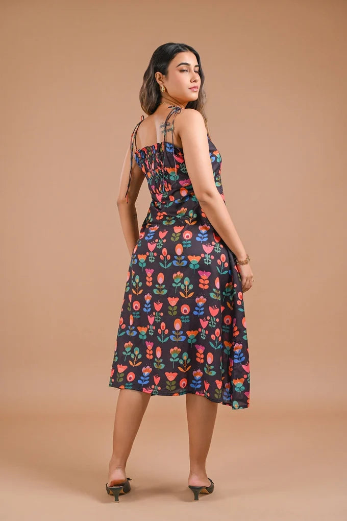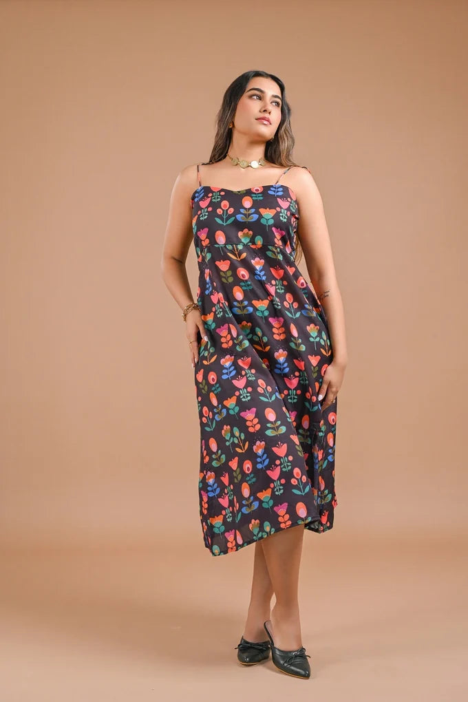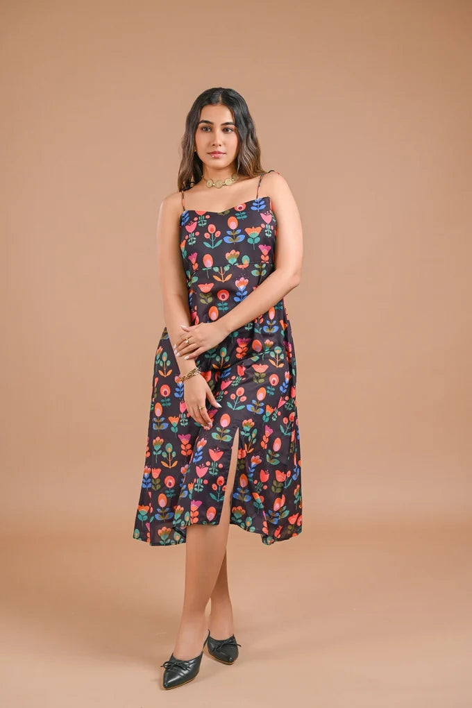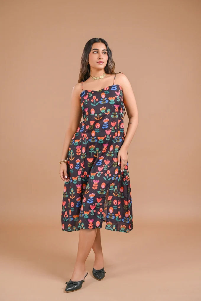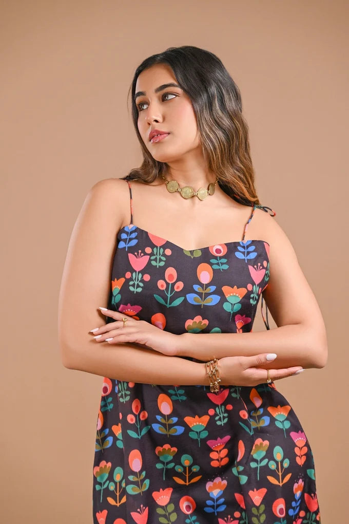 This beautiful midi dress is perfect for a casual day out. The A-line shape is flattering on all body types, and the floral print adds a touch of whimsy. The square neck is a stylish detail, and the sleeveless design makes it perfect for warm weather. The midi length is versatile and can be dressed up or down. Made from muslin fabric. It is lightweight and comfortable, making it perfect for a casual summer look.