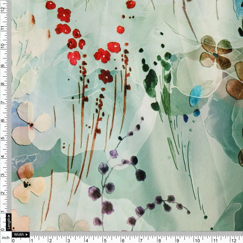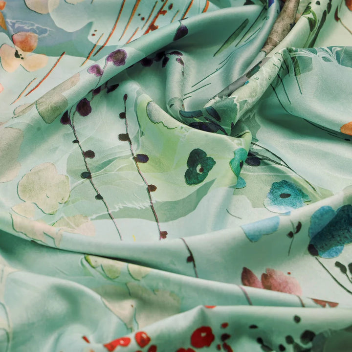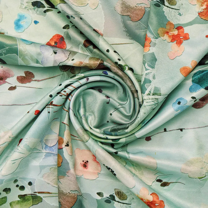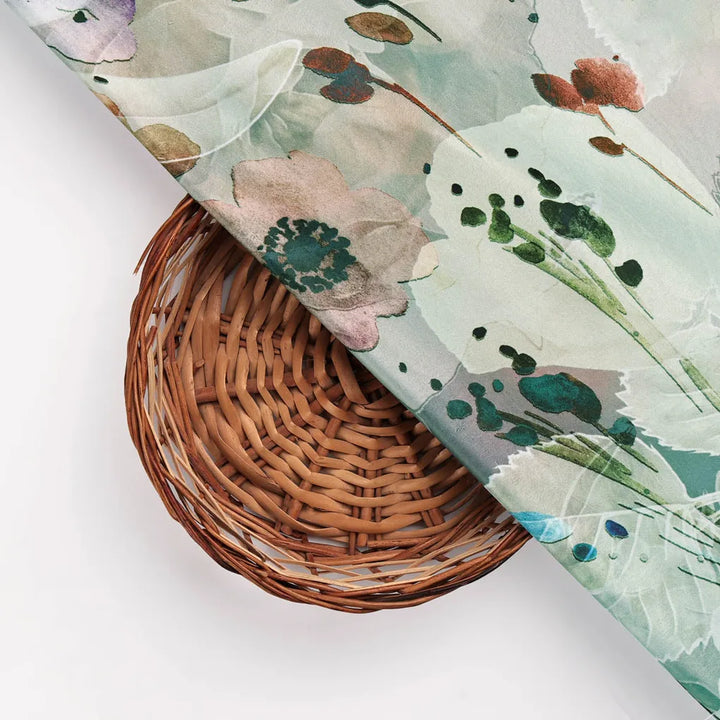 This beautiful floral printed silk fabric features a delicate watercolor design of flowers and leaves in a soft and airy style. The fabric is light and flowy, making it perfect for creating romantic and feminine garments and home decor items. The fabric's luxurious feel and subtle sheen add a touch of elegance to any project. This fabric is perfect for making summer dresses, skirts, blouses, scarves, and other garments, as well as home decor items like cushions, tablecloths, and curtains.