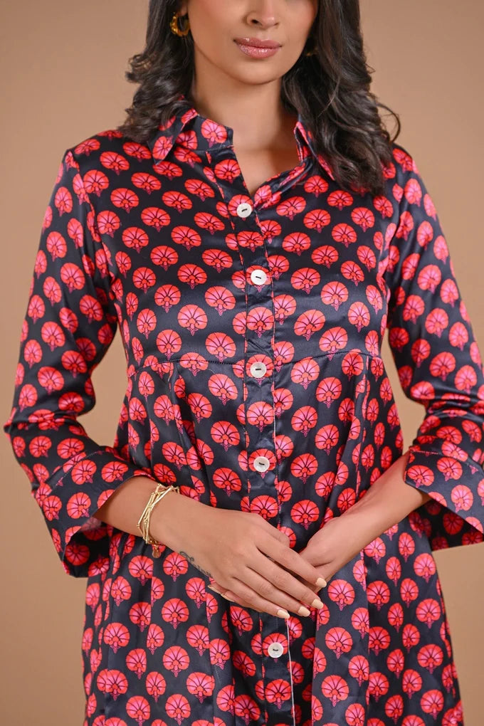 The Japan Satin Co-ord Set is a stylish and comfortable option for casual wear. The set is made from high-quality Japan Satin, which is soft and smooth to the touch. The top features a classic shirt collar and a button-down closure, while the pants have a relaxed fit and a flattering silhouette. The set is printed with a beautiful floral design that adds a touch of elegance to the look. The Japan Satin Co-ord Set is perfect for a day out with friends, a casual dinner date, or a relaxing evening at home.