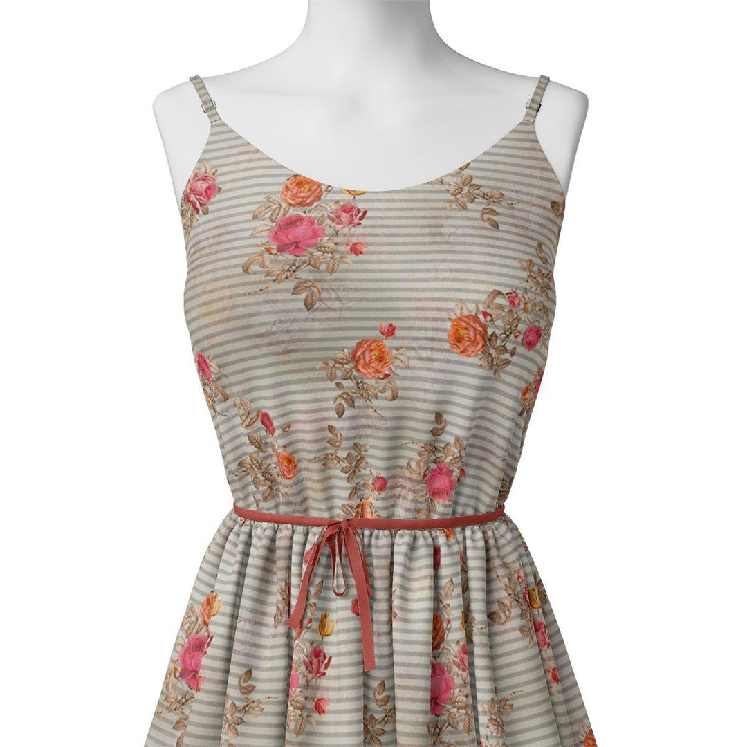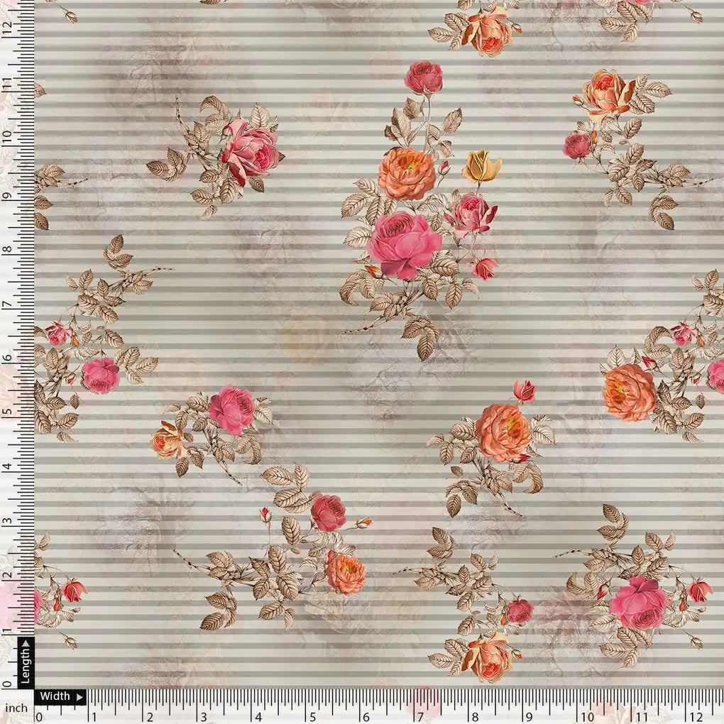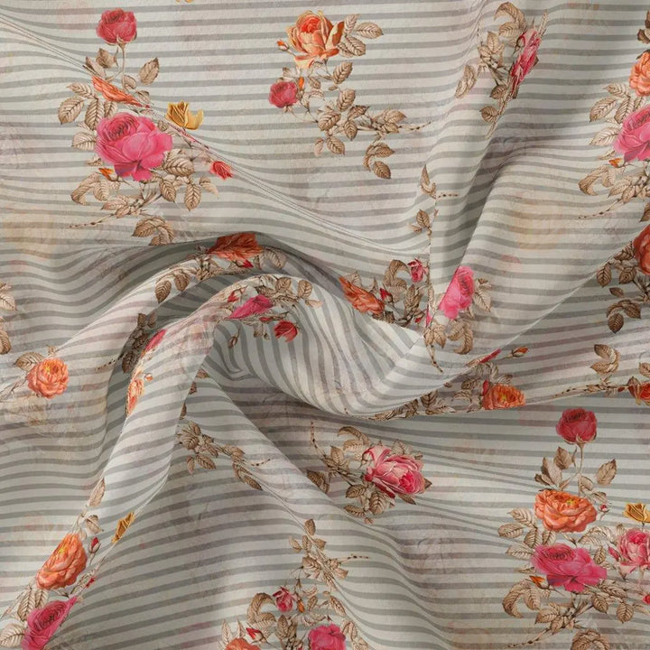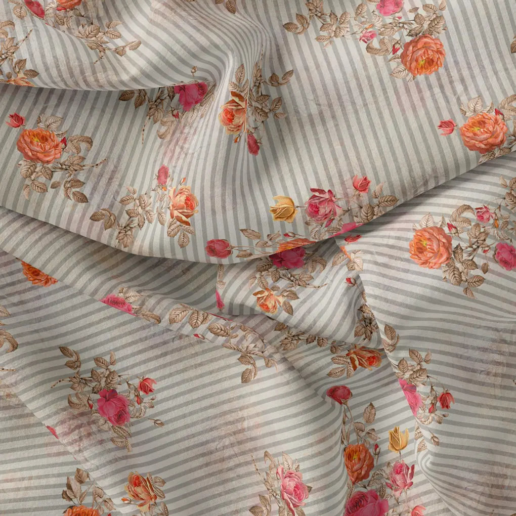 Peony Floral Strips Orange With Red Digital Printed Fabric - Cotton