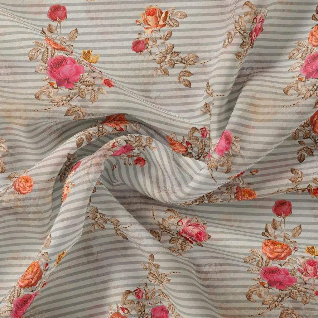 Looking for a unique printed fabric to add to your wardrobe? Look no further than FAB VOGUE Studio's Peony Floral Strips Orange With Red Pure Cotton Salwar Suits Printed Fabric. This high-quality fabric is made of pure cotton and features a beautiful floral pattern in grey. Perfect for salwar suits, this fabric is sure to make you stand out from the crowd. Buy this stunning fabric today from FAB VOGUE Studio and make a lasting impression.