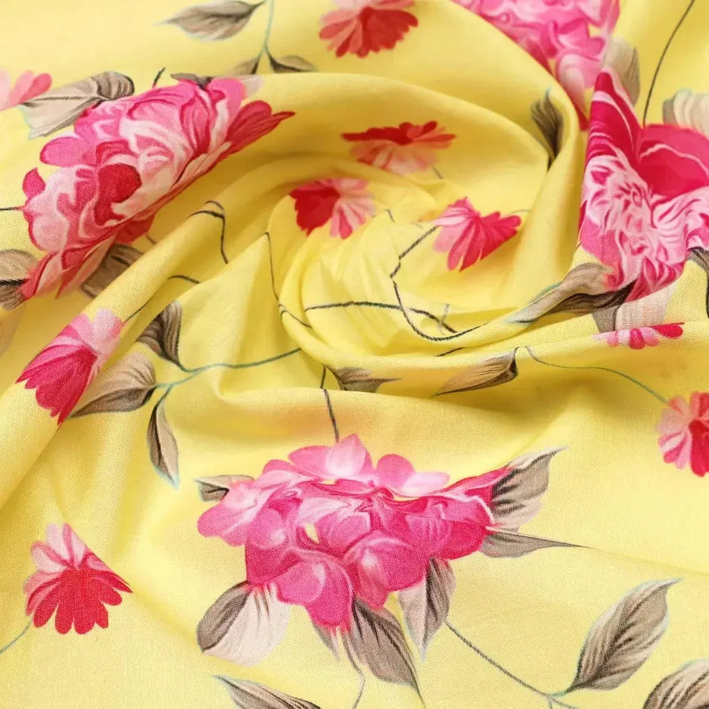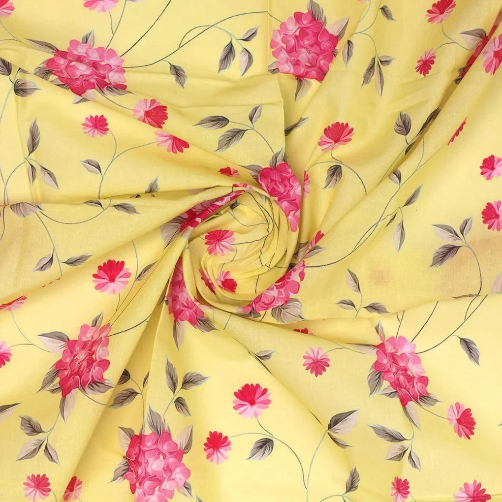 Shop for the gorgeous Pink Flower On Lemon Yellow Pure Cotton Salwar Suits Printed Fabric from FAB VOGUE Studio. This fabric is made from 100% pure cotton, and is digitally printed to give you a stunning look. The fabric features a beautiful floral pattern in a vibrant yellow color. It is perfect for making stylish salwar suits for any occasion.
