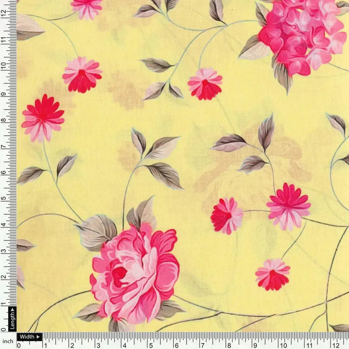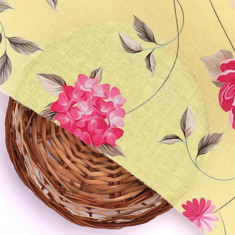 Pink Flower On Lemon Yellow Digital Printed Fabric - Pure Cotton