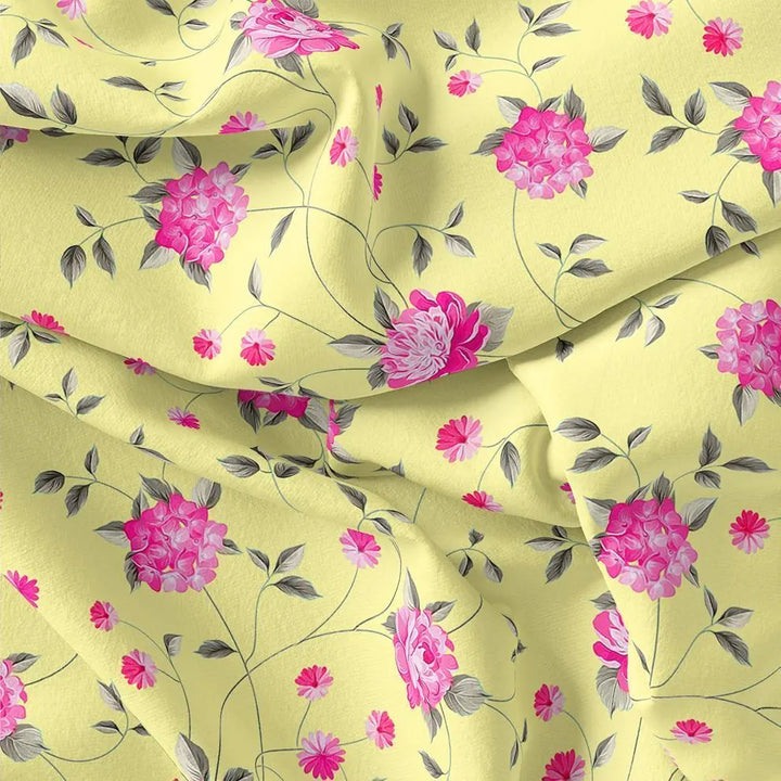 Pink Flower On Lemon Yellow Digital Printed Fabric - Rayon
