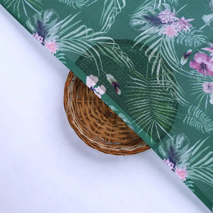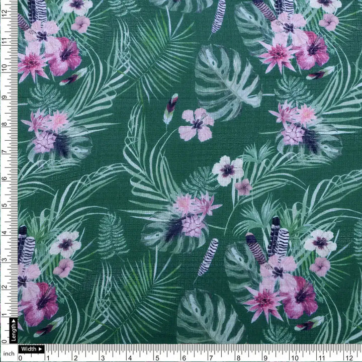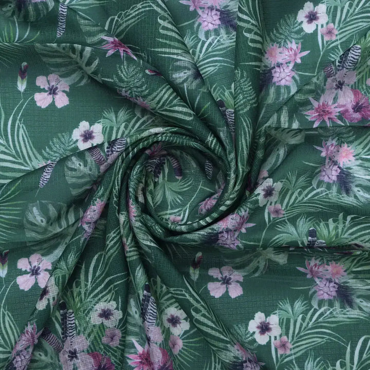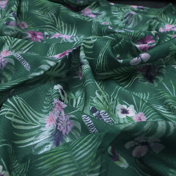 Tropical Leaves and Flowers Printed Kota Doria Fabric