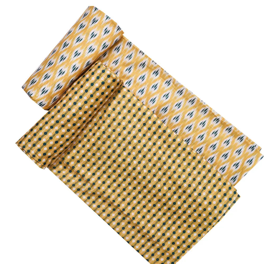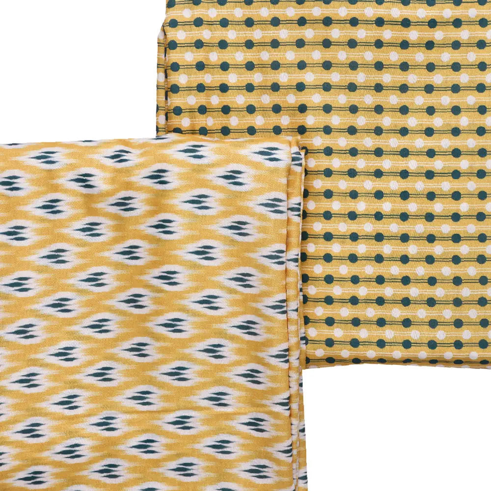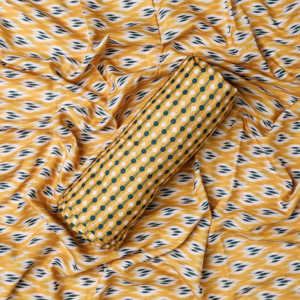 Look your best with this yellow mul cotton printed unstitched fabric set. The eye-catching design features a printed fabric in a classic yellow shade for a timeless style. With both top and bottom fabrics at 2.5 meters each, you'll have plenty of material to work with. Create your own stylish look with this high-quality printed fabric set.